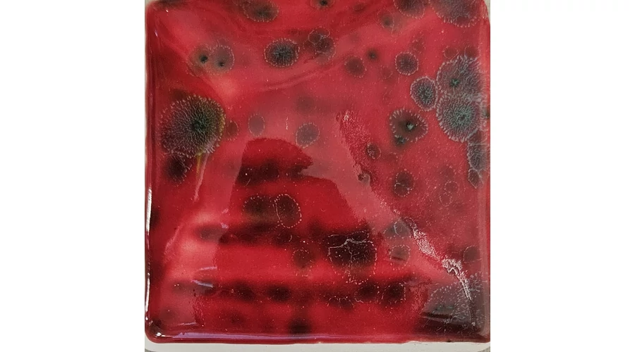 Fényes piros máz granulátummal, effektes.
